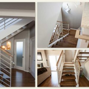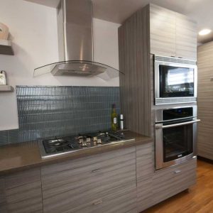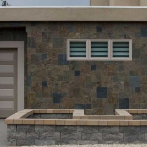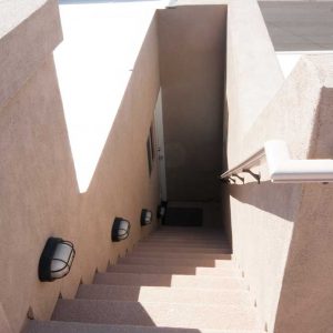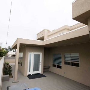 Before the remodel the home was a simple 1155 SF home with brick finish in the front and blue metal panel siding in the back. The home was single story with a flat roof and exposed rafters painted blue to match the front door and trim. There was a single window and entire front of the home and garage was a single plane with the door stepped back 4 feet. This wall was maintained in the remodel; however, the front door now opened into a courtyard that wrapped around into the backyard. The new exterior finish incorporated square stone tiles and stucco, a modern glass garage door, and a 2 tier flat roof with a roof top balcony. The bathrooms incorporate modern faucets and showers that replicate a beach resort. All interior doors are full glass panels to flow with the beach like vibe.