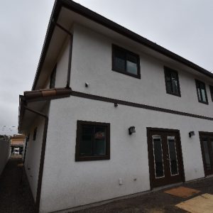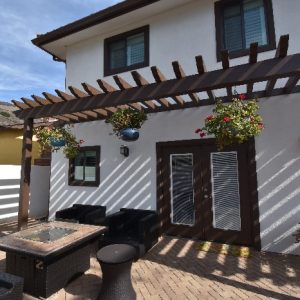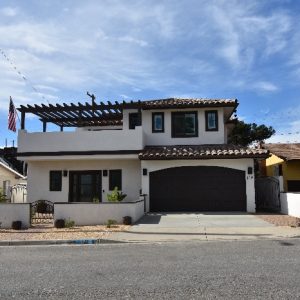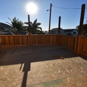 As you continue up the exterior staircase, you find yourself on the rooftop deck with a view of all of Pismo Beach and the dunes of Oceano. The landscaping will continue the Mediterranean feel by incorporating drought tolerant plants, black powder-coated gates, low cmu block walls with a stucco finish, permeable tri-color pavers in a herringbone layout, and sandy gravel. The backyard is covered by a pergola that matches the one covering the second story deck. The back corners of the backyard will be two succulent gardens to represent a modern Mediterranean feel.