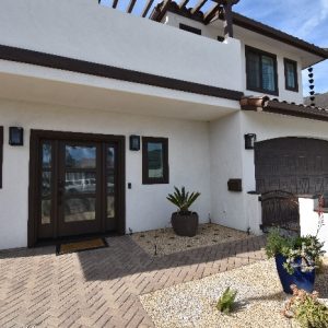 The floor plan incorporates an open layout with arched doorways and a modern Mediterranean feel. The cabinets throughout the entire home are all custom, with a white finish done by Artifex except for the island which is a contrasting ocean blue. The countertops are all a custom marble finish with the back-splash matching the blue and white feel of the cabinets. The second story balcony is covered by a trellis painted to match the fascia color.